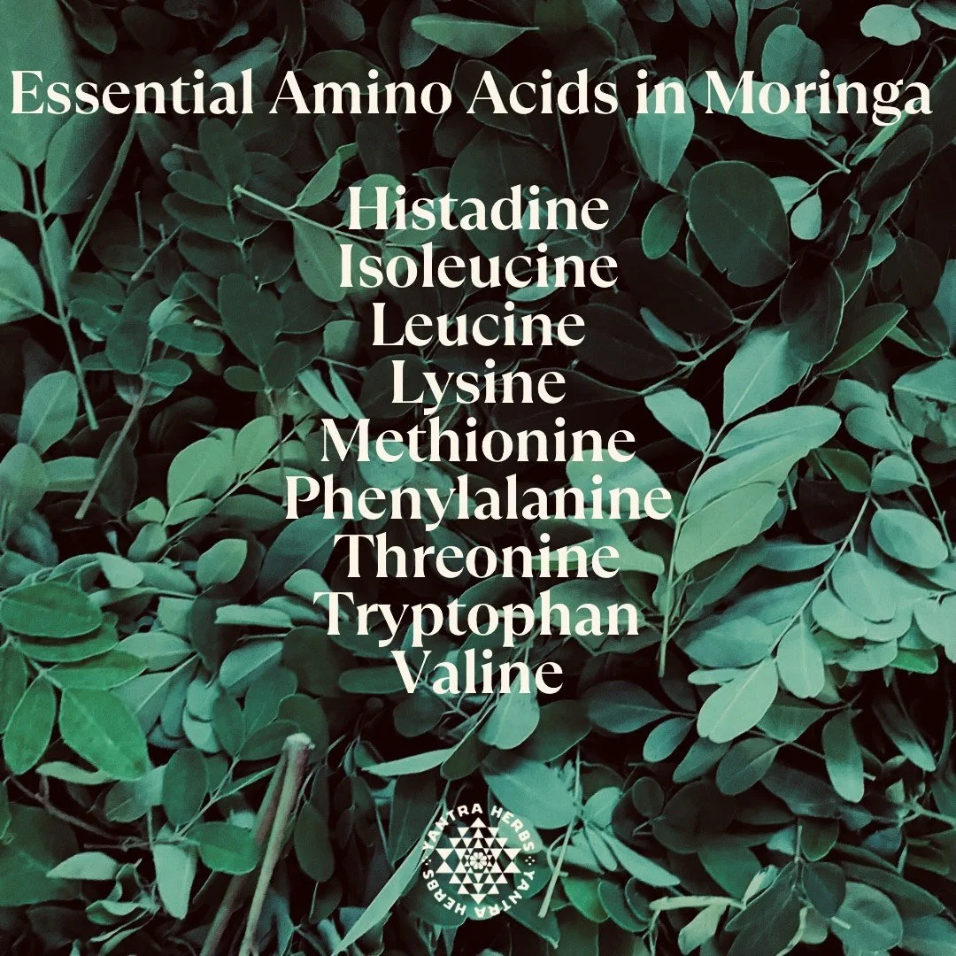 The plant’s phytochemistry includes anti-oxidant, anti-microbial, anti-bacterial, anti-fungal, anti-viral, anti-parasitic, hepatoprotective, anti-tumour, hypotensive, anti-obesity, anti-cholesterol & anti-depressant properties. Analysis of Moringa leaf extract reveals more than 15 kinds of amino acids, including threonine, lysine, leucine, isoleucine, phenylalanine, valine, methionine and tryptophan, while non-essential amino acids include histidine, proline, tyrosine, aspartate acid, glycine, arginine, alanine, glutamate acid, serine & cysteine. It is rare quality for a plant to have all 9 essential amino acids, which are essential for protein metabolism & play a major roll in neuronal and central nervous system function, and in balancing immunity and metabolism.